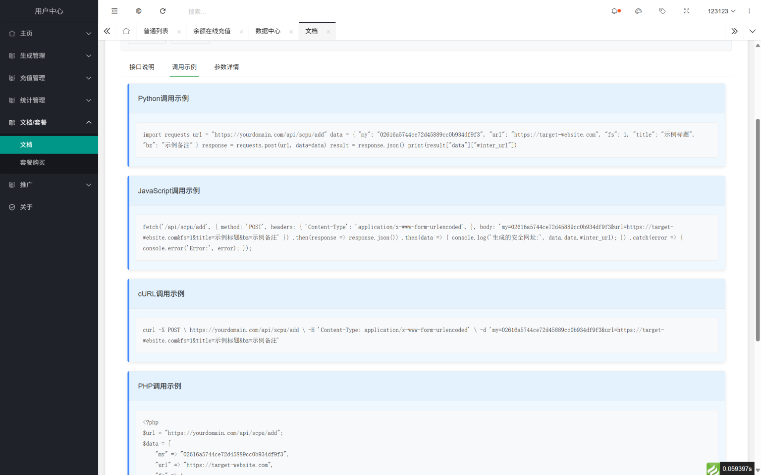 文档详情:提供详情参数,请求地址,可POST/GET请求数据,返回数据等,以及具体参数内容讲解与示范,Java/Python/Php/Curl等参考示例代码