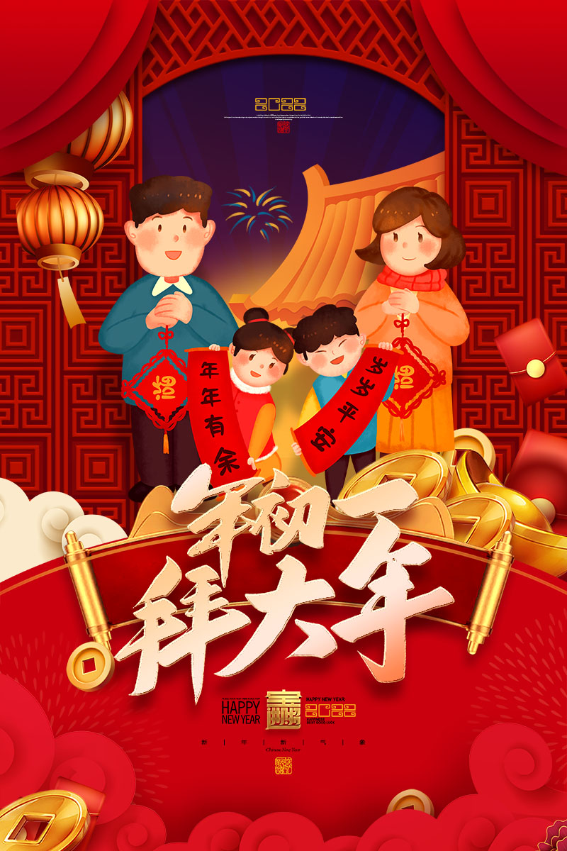 长亭素材 PSD 红色喜庆大年初一拜大年新年系列插画海报设计 https://sc.uuuseo.cn/1681.html